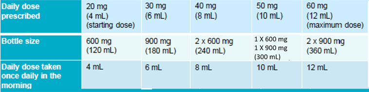 - המינון ההתחלתי המומלץ הוא 20 מ"ג ליום. בילדים מגיל 6 ומעלה ניתן להעלות את המינון בטיטרציה שבועית של 10-20 מ"ג עד למינון מקסימלי מומלץ של 60 מ"ג ליום.